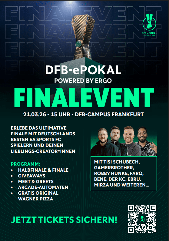 Am 21. März 2026 findet am DFB-Campus in Frankfurt am Main das Finalevent des DFB-ePokal powered by ERGO statt. Der DFB-ePokal ist eines der bedeutendsten Events im deutschen E-Football und verbindet Fußball, Gaming und Entertainment auf höchstem Niveau. Beim Finalevent treffen die besten E-Football-Spieler Deutschlands aufeinander – begleitet von bekannten Creator aus der Gaming- und Fußballszene.
