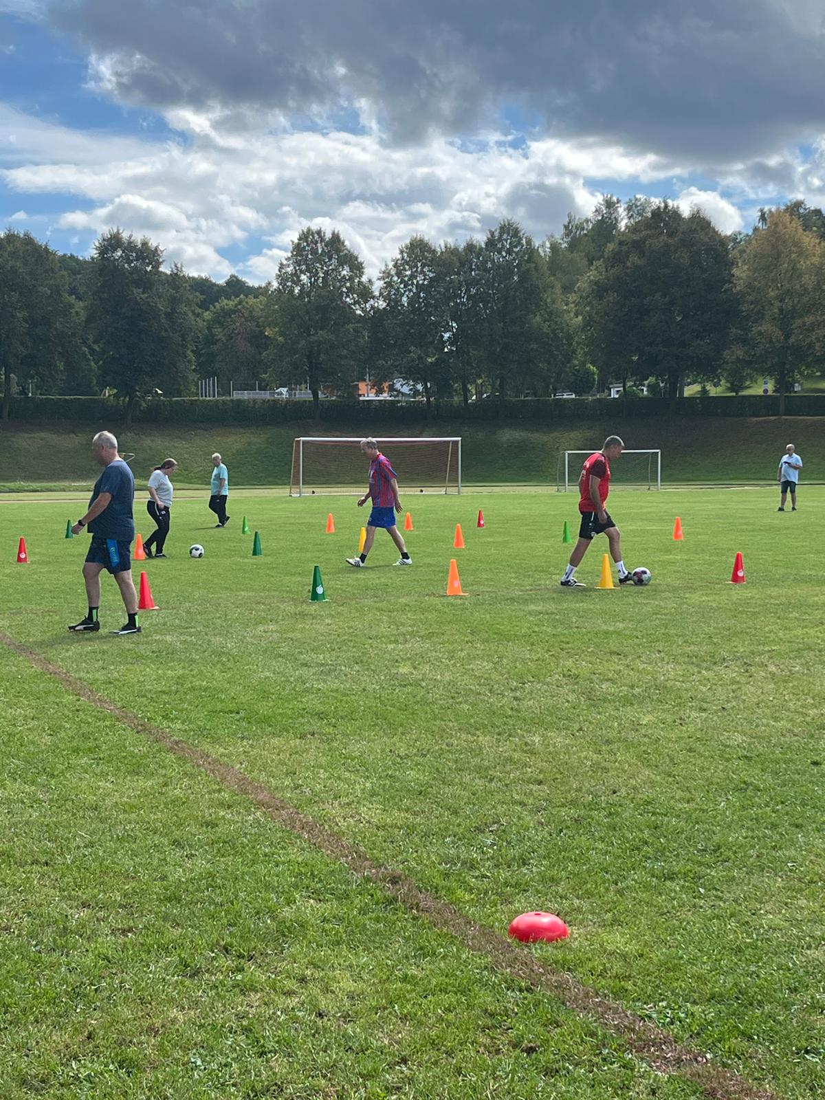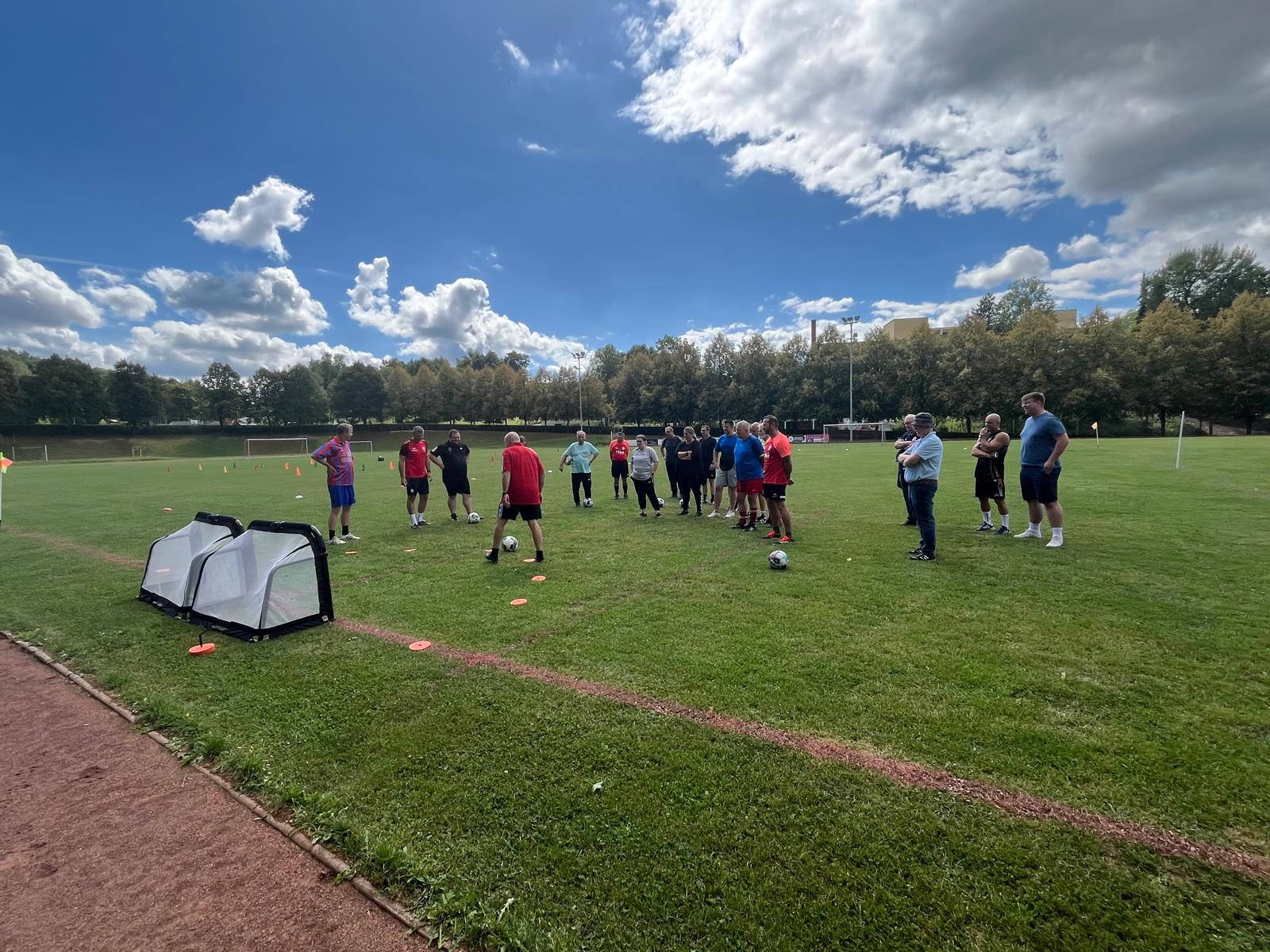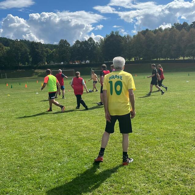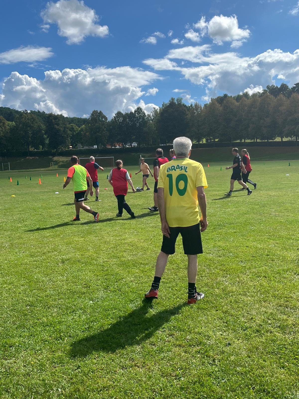 Laufen ist verboten! Gehen bleibt Pflicht – so werden Verletzungen vermieden und auch ältere Spieler erleben den Fußballspaß in entspannter Atmosphäre. Gespielt wird auf kleineren Feldern und mit kleineren Toren – ohne Torwart, aber mit viel Freude am Spiel.