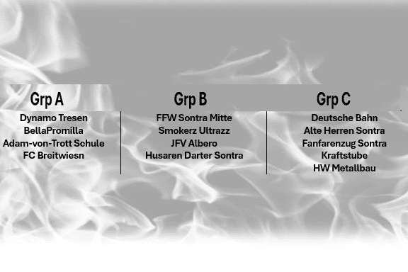 Gruppe B hat definitiv die Zutaten für Drama, Tempo und pure Leidenschaft. FFW Sontra Mitte kommt mit ordentlich Erfahrung daher, aber Smokerz Ultrazz, JFV Albero und Husaren Darter Sontra haben schon mehr als einmal bewiesen, dass Energie und Teamgeist die großen Favoriten ins Wanken bringen können. Hier dürften wir Atem-anhaltende Duelle und vielleicht sogar eine kleine Sensation erleben.