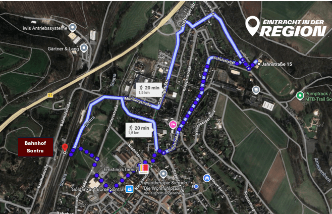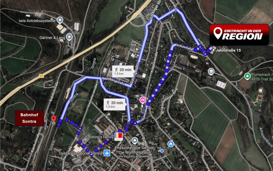 Vom Bahnhof Sontra etwa 10–15 Minuten Fußweg zum Stadion (Jahnstraße).